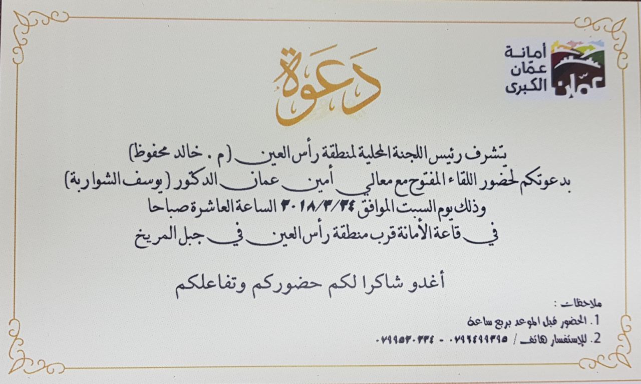شبكة وهج نيوز : رئيس اللجنة المحلية لمنطقة راس العين ، المهندس خالد محفوظ يوجه دعوة لحضور اللقاء المفتوح مع معالي أمين عمان الدكتور يوسف الشواربة ، وذلك يوم السبت الموافق 24-3-2018 ، تمام العاشرة صباحا في قاعة الأمانة قرب منطقة راس العين في جبل المريخ .