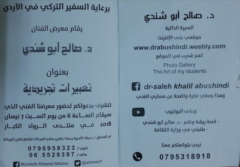 شبكة وهج نيوز – محيي الدين غنيم : برعاية سعادة السفير التركي في عمان يقيم الفنان الدكتور صالح أبو شندي معرض بعنوان ” تعبيرات تجربدية ” وذلك تمام الساعة السادسة من يوم السبت الموافق 7-4-2018 في منتدى الرواد الكبار بمنطقة أم السماق .