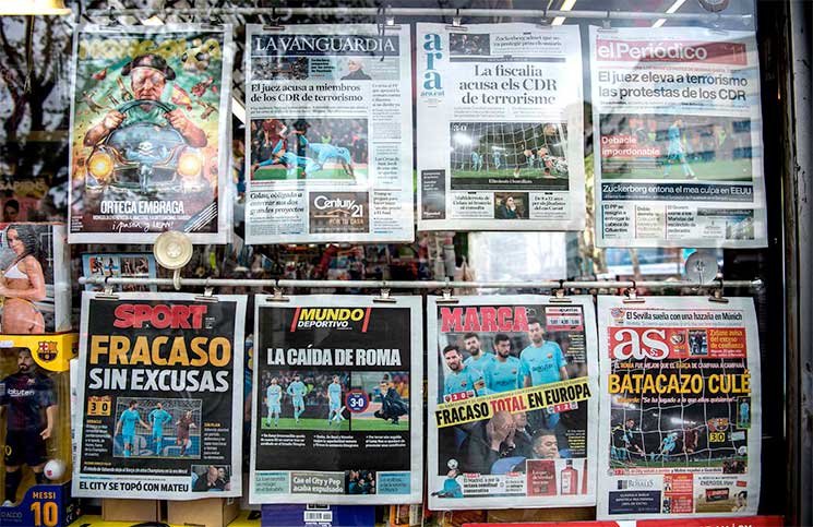 شبكة وهج نيوز : شنت الصحف الإسبانية الصادرة الأربعاء هجوما شرسا على برشلونة عقب خروجه المفاجئ من دوري أبطال أوروبا على يد روما، واستخدمت لوصف ما حدث كلمات لاذعة مثل «فشل بلا مبرر» و»حماقة».