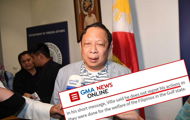 وذكرت شبكة GMA الفلبينية أن السفير صرح خلال تكريمه وفي كلمة نصية أنه «ليس نادماً على تصرفاته»، مضيفاً أن «ما فعله هو من أجل رفاهية العمال الفلبينيين في الدولة الخليجية».