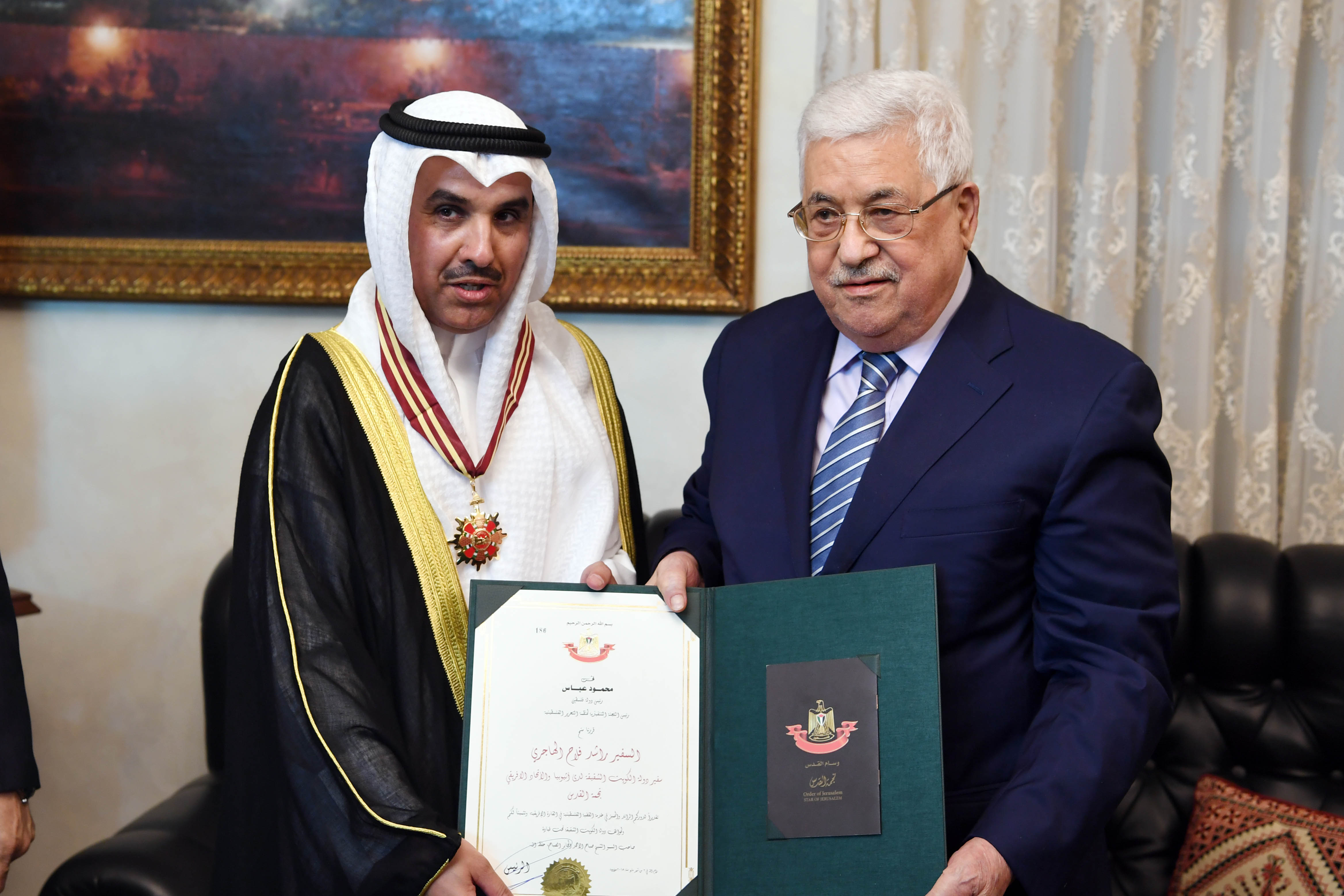 ومنح الرئيس، السفير الكويتي راشد الهاجري، نجمة القدس، تقديراً لدوره الرائد والمتميز في خدمة القضية الفلسطينية في القارة الافريقية، وتثميناً له ولمواقف دولة الكويت الشقيقة تحت قيادة صاحب السمو الشيخ صباح الاحمد الجابر الصباح حفظه الله.