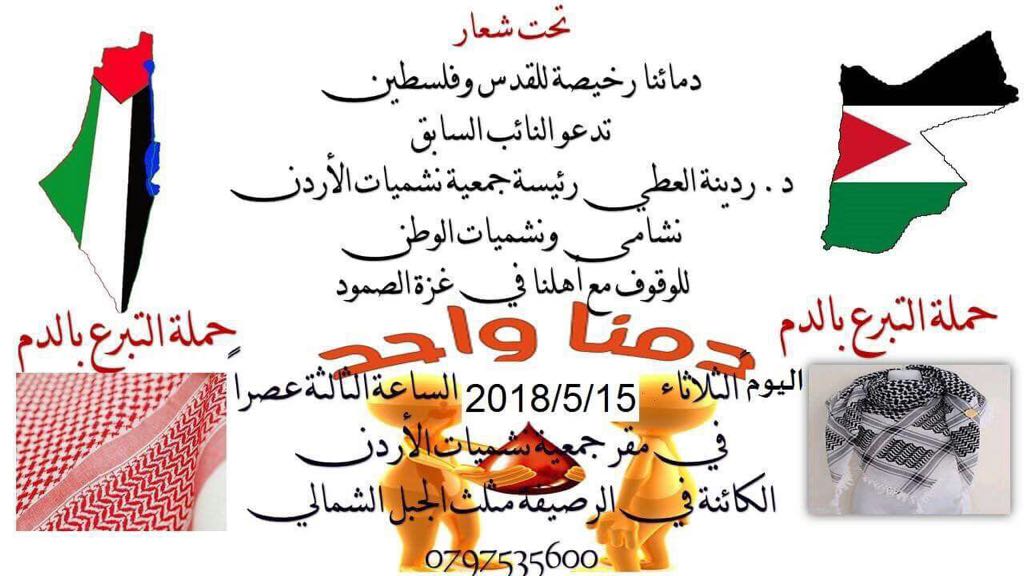 شبكة وهج نيوز : تحت شعار دمائنا رخيصة للقدس وفلسطين تدعو النائب السابق ” د. ردينة العطي ” رئيسة جمعية نشميات الأردن نشامى ونشميات الوطن للوقوف مع أهلنا في غزة الصمود من خلال حملة التبرع بالدم وذلك يوم الثلاثاء 15-5 تمام الساعة الثالثة عصرا في مقر جمعية نشميات الأردن ، الكائنة في الرصيفة – مثلث الجبل الشمالي .