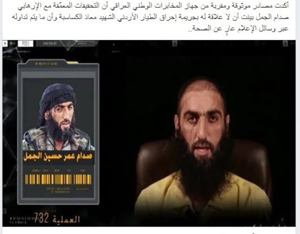شبكة وهج نيوز : أكد مصدر في المخابرات العراقية أن التحقيقات مع الارهابي الداعشي صدام الجمل، والذي تم اعتقاله مؤخرا، بينت أن لا علاقة له بجريمة قتل الشهيد الطيار معاذ الكساسبة.