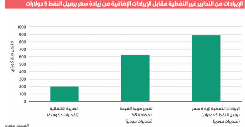 وبحسب تقديرات الوكالة، فإن قرار تأجيل تنفيذ ضريبة القيمة المضافة يمكن أن يكلف الحكومة الكويتية ما نسبته %1.6 من الناتج المحلي الإجمالي على شكل إيرادات مفقودة. ومع ذلك، فإن صافي التأثير المالي سيعوضه الارتفاع الأخير في أسعار النفط، على اعتبار أن زيادة أسعار النفط بمقدار 5 دولارات للبرميل ستولد عوائد مالية سنوية أكبر من ضريبة القيمة المضافة بحسب التقديرات.