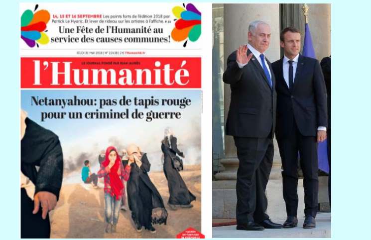 وحذرت’’ ليمانيتي’’ من مغبة أن استقبال رئيس الحكومة الإسرائيلية في فرنسا، بلد الإعلان العالمي لحقوق الإنسان، سيكون بمثابة استقبال رجل يواجه تهمة ارتكاب جرائم حرب. كما أن الخطوة ستكون بمثابة محاولة من الحكومة الفرنسية’’ إيجاد عذر لدولة ليس لها حدود معترف بها دوليا، تقوم على الاحتلال والاستعمار’’. كما اعتبرت الصحيفة أن عجز السلطات الفرنسية عن فرض احترام القانون الدولي كل ما تعلق الأمر بإسرائيل، من شأنه أن يعزز حركة مقاطعة إسرائيل وسحب الجنسية منها وفرض العقوبات عليها— BDS (وهي حركة فلسطينية ذات امتداد عالمي، تسعى إلى تحقيق الحرية العدالة والمساواة وتعمل من أجل حماية حقوق الشعب الفلسطيني غير القابلة للتصرف).