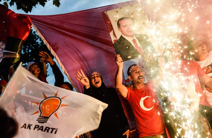 واحتفل أنصار أردوغان بفوزه في الانتخابات حيث خرجوا في مسيرات ورددوا هتافات تأييده.