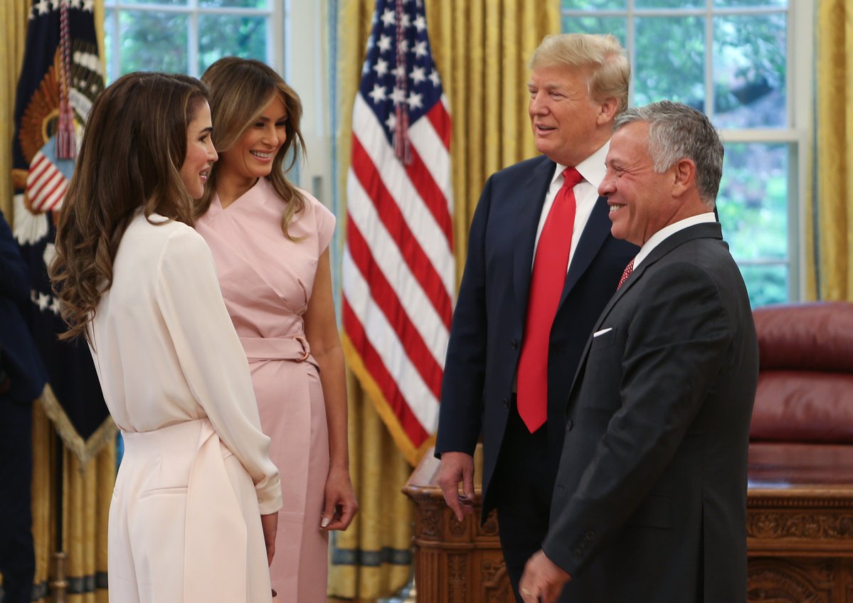 من جهته، قال الرئيس الأمريكي دونالد ترمب ‘يسعدنا كثيرا أن ينضم إلينا اليوم ملك وملكة الأردن، الذين تجمعنا بهما صداقة قديمة. إنكم تقومون بعمل وجهد رائع فيما يتعلق باللاجئين، ومخيمات اللجوء، وتقديم العون’.