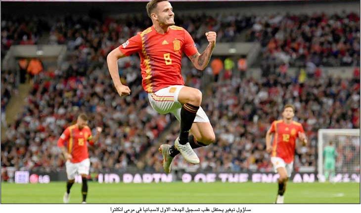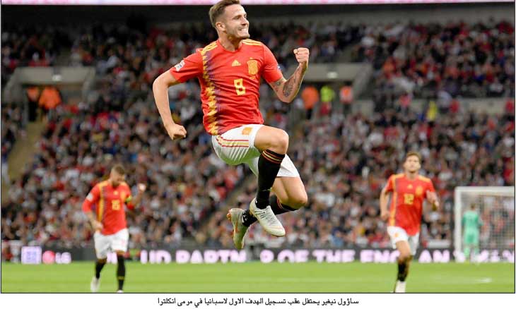 وعقب ثمانية أسابيع من مسيرة رائعة في كأس العالم انتهت أمام كرواتيا في الدور قبل النهائي، بدا أداء انكلترا التي سادها التفاؤل، مقبولا مع افتتاح ماركوس راشفورد التسجيل عقب 11 دقيقة. لكن اسبانيا، التي ضمت خمسة لاعبين فقط من الذين شاركوا في التشكيلة الأساسية التي خاضت مباراة دور الـ16 في نهائيات كأس العالم عندما خسر أمام روسيا بركلات الترجيح، ردت قبل نهاية الشوط الاول عن طريق ساؤول نيغيز ورودريغو. وألقت اصابة لوك شو الظهير الايسر لانكلترا، والتي تبدو بالغة واحتاجت لوقت طويل للعلاج بعدما اصطدمت رأسه بداني كاربخال، بظلالها على الشوط الثاني. وهددت اسبانيا بزيادة تقدمها مع استحواذها على الكرة، لكن انكلترا أنهت بقوة وأهدر راشفورد فرصة خطيرة للتعادل عندما سدد مباشرة في ديفيد دي خيا، قبل ان يلغي الحكم هدفا سجله البديل داني ويلبيك في الوقت بدل الضائع. وهذه اول هزيمة لانكلترا في آخر 25 مباراة رسمية على ملعب «ويمبلي». وستواجه انكلترا واسبانيا منتخب كرواتيا وصيف بطل كأس العالم ضمن المجموعة الرابعة في الدرجة الاولى لدوري الامم، وهي بطولة جديدة اطلقها الاتحاد الاوروبي للعبة ليضيف المزيد من الاثارة لجدول المباريات الدولية. وبدت الأجواء رائعة في ملعب «ويمبلي» في ظل حضور جماهيري بلغ 81 ألف متفرج. وانطلقت المباراة عقب تقديم جائزة الحذاء الذهبي لهداف كأس العالم والتي فاز بها هاري كاين قائد منتخب انكلترا بواسطة غاريث ساوثغيت مدرب المنتخب وصاحب الشعبية الكبيرة. وبدأت انكلترا بقوة وتقدمت في الدقيقة 11 بهدف رائع كشف عن مستوى الاداء الذي يريد ان يقدمه المدرب ساوثغيت. ودفعت انكلترا، التي لجأت لتحضير اللعب من الخلف، الكرة باتجاه كاين الذي مرر لشو في الناحية اليسرى الذي أرسل تمريرة عرضية متقنة لراشفورد ليهز الأخير شباك دي خيا حارس مانشستر يونايتد. وكانت الجماهير صاحبة الارض في خضم احتفالاتها بهدف السبق عندما تعادلت اسبانيا بعدها بدقيقتين، بعد تحرك سلس من لاعبيها ليسدد ساؤول في مرمى جوردان بيكفورد بعد تمريرة متقنة للخلف من تياغو الكانتارا. وارتكب كيران تريبيير خطأ ضد ماركوس الونسو في الدقيقة 32 ادى لاحتساب ركلة حرة نفذها الكانتارا باتجاه رودريغو عند القائم القريب ليسجل الأخير في ظل غفلة من دفاع انكلترا. واستطاع أسلوب اسبانيا الممتع ان يوجد ثغرات في دفاع انكلترا، وتمكن لاعبون مثل ايسكو والكانتارا وساؤول من دفع انكلترا للعودة الى الخلف. وتصدى دي خيا وبحركة بهلوانية لمحاولة راشفورد لتسجيل الهدف الثاني لانكلترا بعدها بقليل، لكن اسبانيا أنهت الشوط الاول متقدمة. وبدا ان اصابة شو أسكتت الجماهير، وساعد ارتباك انكلترا في مواصلة اسبانيا لضغطها. وقال ساوثغيت عن هدف ويلبيك الذي ألغي انه كان يجب احتسابه، لكنه أقر بأن فريقه عانى للتصدي لأسلوب لعب اسبانيا القائم على التمرير. وأضاف: «لا يوجد أدنى شك في ان اسبانيا كانت الأفضل لفترات طويلة. لكنني فخور بالطريقة التي انهينا بها المباراة. شاهدت فرقا انهارت في ظل ظروف مشابهة».