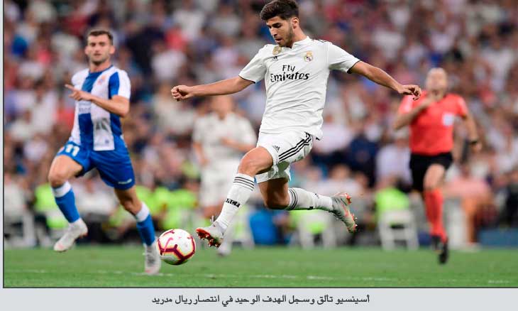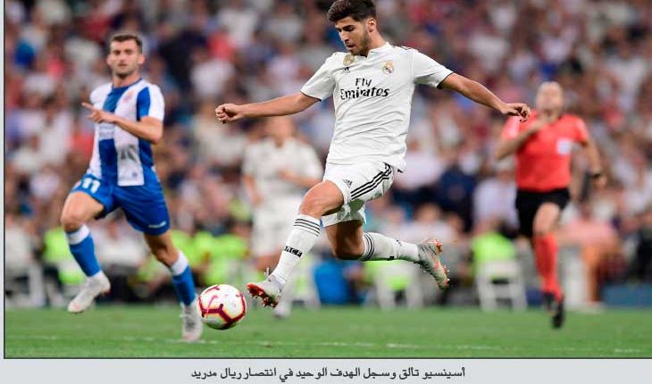 وتعرضت تشكيلة المدرب يولن لوبيتيغي لاختبار من الفريق الزائر على استاد «سانتياغو برنابيو» حيث سدد بورخا إغليسياس في العارضة لكن الريال تماسك ليحقق الفوز. وعقب انتصار رائع في دوري أبطال اوروبا على روما الاربعاء الماضي، أدخل لوبيتيغي تغييرات على تشكيلته قبل مواجهة اسبانيول السادس في الترتيب عقب بدايته الجيدة هذا الموسم. وأراح المدرب غاريث بيل ومارسيلو وتوني كروس، ومنح فرصة للمدافع الفارو اودريوزولا للظهور لأول مرة بديلا لداني كاربخال المصاب. واستحوذ الريال على الكرة لكن اسبانيول شكل تهديدا دائما في الهجمات المرتدة. وسدد بابلو بياتي بعيدا عن المرمى للفريق الزائر واستطاع تيبو كورتوا ابعاد محاولة من هرنان بيريز. وانتزع اصحاب الارض التقدم قبل نهاية الشوط الاول بأربع دقائق بعد تسديدة لوكا مودريتش التي غيرت اتجاهها بشكل كبير لكنها وصلت لأسينسيو الذي سجل أول اهدافه في الدوري هذا الموسم. واضطر مهاجم الريال لانتظار اللجوء لتقنية حكم الفيديو المساعد لاثبات انه غير متسلل قبل ان يحتفل بالهدف. وراوغ إغليسياس مهاجم اسبانيول سيرجيو راموس قائد الريال مع بداية الشوط الثاني ولعب الكرة من فوق الحارس كورتوا لكن تسديدته ارتدت من العارضة.