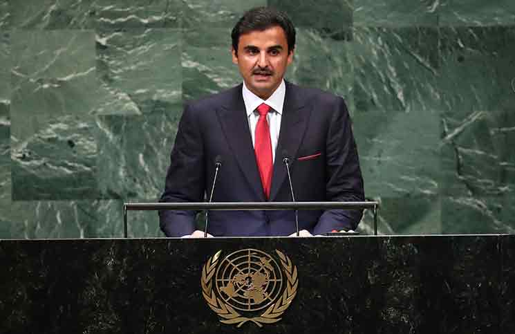وخلال كلمته أمام الجمعية العامة للدورة الـ 73 للأمم المتحدة، قال أمير قطر إنه لا بد من تجاوز إدارة الأزمات والسعي لإيجاد حلول لها بعيدا عن الانتقائية وازدواجية المعايير ورفض سياسية فرض الأمر الواقع بالقوة، لافتاً إلى أن بلاده تقدر ضرورة وجود نظام دولي شرعي يسود فيه القانون، مشدّداً في الوقت ذاته على ضرورة القيام بإصلاحات تمكّن الأمم المتحدة القيام بمهامها، بما يستجيب لتطلعات الشعوب، وتحقيق عدالة مستدامة.