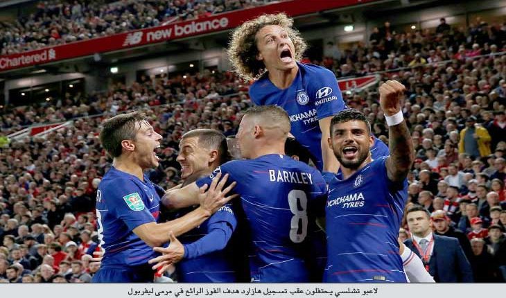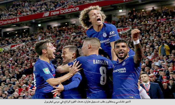 واستهل ليفربول الموسم بتحقيق ستة انتصارات متتالية في الدوري الممتاز بجانب فوزه في دوري أبطال أوروبا لكنه خرج من كأس الرابطة بعد عزف منفرد من هازارد منح فريق المدرب ماوريتسيو ساري هدف الانتصار في الدقيقة 85. ووضع مهاجم تشلسي السابق دانييل ستاريدج ليفربول في المقدمة في الدقيقة 58 بتسديدة بهلوانية ليعوض فرصة أضاعها أمام مرمى مفتوح. وتعادل ايمرسون لتشلسي في الدقيقة 79 من متابعة لتسديدة بالرأس من روس باركلي ارتدت من الحارس سيمون مينيوليه بعد ركلة حرة نفذها هازارد. وراجع حكم الفيديو الهدف وأثبت صحته رغم أن يورغن كلوب مدرب ليفربول شعر بأنه كان يجب أن يلغى بداعي التسلل. وحسم النجم البلجيكي الذي نزل بديلا في الدقيقة 56، اللقاء بعد مراوغة العديد من لاعبي ليفربول وأنهى الهجمة التي قادها بنفسه بشكل رائع. وقال جانفرانكو زولا مساعد مدرب تشلسي: «إنه هدف مذهل. ليس فقط بسبب جماله بل لتوقيته أيضا. هازارد ليس أحد أفضل لاعبي الدوري الانكليزي وحسب، إن لم يكن الأفضل، بل أحد أفضل اللاعبين في أوروبا والعالم». وأضاف: «من وجهة نظري لم نشاهد أفضل ما لديه بعد. إنه مبهر». وسيتجدد اللقاء بين الفريقين في استاد «ستامفورد بريدج» غدا السبت في الدوري الممتاز. وحقق وستهام فوزا ساحقا 8-صفر على مكليسفيلد المنتمي للدرجة الثالثة، كما سجل داني ويلبيك هدفين في فوز أرسنال 3-1 على برينتفورد. وبلغ توتنهام دور 16 بتغلبه بركلات الترجيح 4-2 على واتفورد في مواجهة بين فريقين من الدوري الممتاز انتهى وقتها الأصلي بالتعادل 2-2. وتغلب نوتنغهام فورست 3-2 على ستوك في لقاء بين فريقين من الدرجة الأولى.