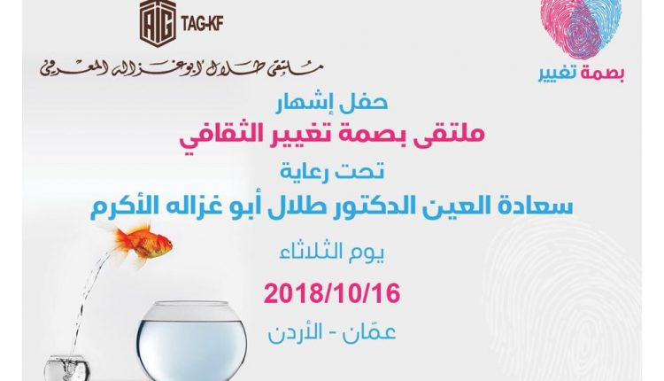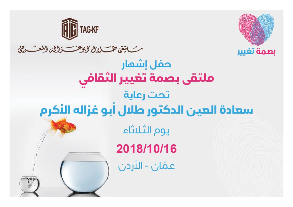 وهج 24 : تحت رعاية سعادة العين الدكتور طلال أبو غزالة الأكرم ، تتشرف الهيئة الإدارية بدعوتكم لحضور حفل إشهار “ملتقى بصمة تغيير الثقافي ” وذلك في تمام الساعة الخامسة من مساء يوم الثلاثاء الموافق 16-10-2018 في ملتقى طلال أبو غزالة المصرفي والكائن في منطقة الشميساني – شارع عبدالرحيم الواكد – بناية رقم 46 .