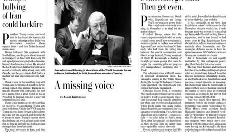 ونشرت صحيفة” واشنطن بوست” مقالها الافتتاحي ، باللغتين العربية والانجليزية، للتعبير عن القلق من اختفاء خاشقجي .