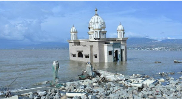 المسجد الواقع على ضفة البحر في “بالو” تعرض كباقي الكثير من الأبنية السكنية لزلزال عنيف وأمواج تسونامي أواخر سبتمبر / أيلول الماضي.
