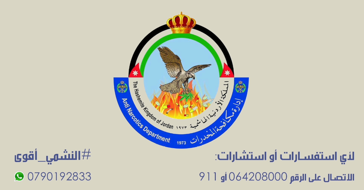 وأكّدت الإدراة على وقوفها إلى جانب كل من وقع ضحية المخدرات ومروجيها، من خلال التعامل بسريّة تامة مع أي حالة ترد إليها، داعية أي شخص يحتاج إلى مساعدة مهما كان نوعها، لعدم التردد بالاتصال على الرقم 064208000، أو رقم الطوارئ الموحد 911، أو من خلال الرقم المخصص للواتساب 0790192833، وصفحة الإدارة على الفيسبوك.