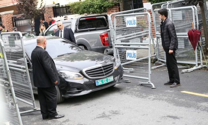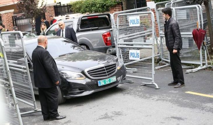 ووصل المسؤولون عبر 3 سيارات، أمام القنصلية الواقعة بحي “لفنت” التابع لمنطقة بشيكطاش بإسطنبول، ثم دخلوا مبنى القنصلية.