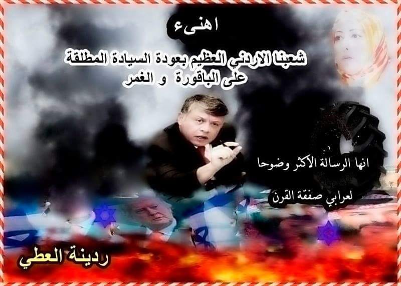 النائب السابق “ردينة العطي ” تهنئ بعودة السيادة على الباقورة والغمر On أكتوبر 22, 2018 Share وهج 24 : النائب السابق ردينة العطي تهنئ الشعب الأردني بعودة السيادة المطلقة على الباقورة والغمر . Share FacebookTwitterGoogle+ReddItWhatsAppPinterestالبريد الإلكتروني