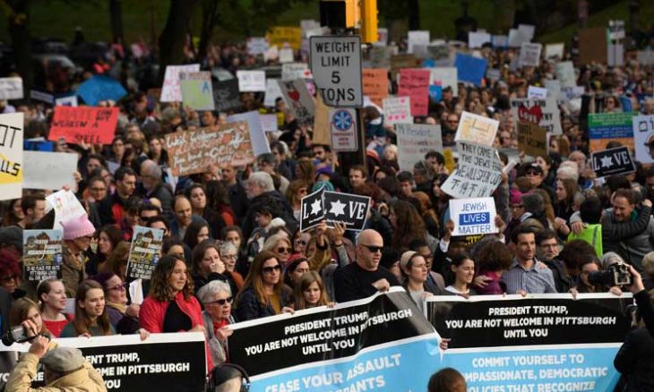 وفي كنيس “شجرة الحياة” في بيتسبرغ وبينما كان يسمع هتاف المتظاهرين في الخارج “الكلمات مهمة”، أشعل ترامب شمعة على روح كل من الضحايا الـ11 للهجوم المعادي لليهود الذي أدى إلى سقوط أكبر عدد من القتلى في الولايات المتحدة.