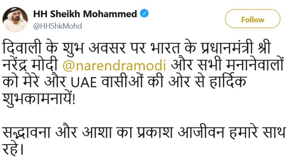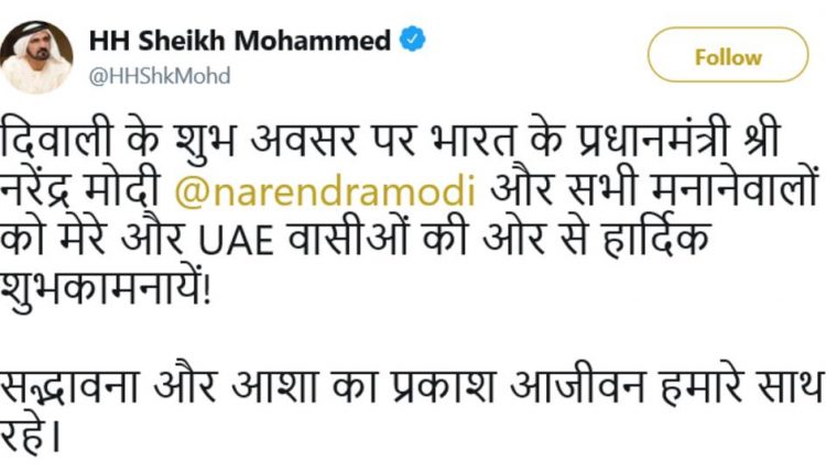 وغرد الشيخ محمد بن راشد بتغريدتين الأولى باللغة الهندية والثانية بالإنجليزية، وكتب “بالنيابة عن أهل الإمارات. أتمنى لرئيس الوزراء الهندي وجميع الذين يحتفلون بديوالي مهرجانا سعيدا وبهيجا، ونرجو أن يضيء نور الحب والأمل علينا جميعًا”.