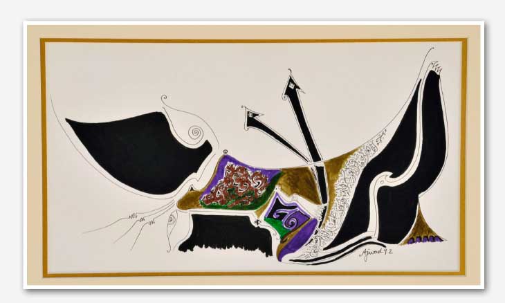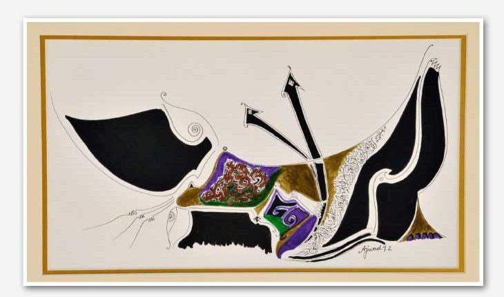 النظرة الأولى للوحة الفنان، قد تدفع الفرز إلى اعتبارها لوحة خط استفادت من الرسم لتشكيل معمار الرقعة الخطية. وهو ما يذهب إليه الخطاطون الذين يعملون على تزويق خطهم وتزويق وزخرفة المساحة الحاضنة للنوع. ولهذا اتخذت الأشكال والهيئات، كما هي هيئة جسد الطير والشجر وغيرها لتكون مساحة لتلبية حاجة الحرف للدلالة. لكن في حالة توسيع النظرة للوحة الفنان أجود تستوقفنا البنى المستدعية للحرف، وليس العكس. بمعنى نرى الاستجابة تنطلق من اللوحة باتجاه مكوناتها، وهي الحروف والعبارات العرفانية والمقدس، كالآيات من سور القرآن وعبارات الأولياء والصالحين والحِكَم. غير أن ما يملي علينا مثل هذه القراءة هو طبيعة اللوحة القادرة على استيعاب مساحة الحرف الدلالية، وشكله المرن وتشكلاته الأفقية، خاصة التي تُضاف إلى تشكلاته العمودية. فالحرف العربي من المرونة بحيث تساير الفنان في أشد الحالات المراد التعبير عنها كما سنرى في مجريات قراءتنا. إن مرونة الحرف كبنية خطية، ساهمت في خلق بنية تشكيلية، مقابل قدرة الفنان على التخيل دفعته إلى مغادرة موقع الحرف، باعتباره خطاً نحو دلالته المستثمرة على السطح. وبهذا حقق الفنان درجة من هذا التوظيف الذي عمل عليه معظم الفنانين، خاصة شاكر حسن آل سعيد حيث كان توظيف الحرف لا يبتعد بالكلية المطلقة من حروفية الفنان أجود، غير أنه اختلف عنه في الكيفية. فحرف آل سعيد عرفاني خالص، بينما حرف أجود عامل مُعين لمحتوى اللوحة. ويمكن اعتباره كلاً بنيوياً للعمل.