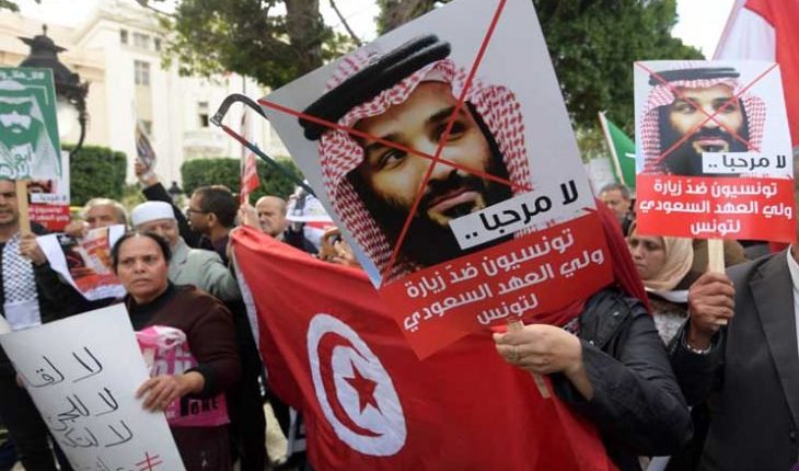 وشارك مئات التونسيين في أول احتجاجات بالعالم العربي ضد ولي العهد السعودي الذي زار تونس يوم الثلاثاء حيث اتهموه بالضلوع في قتل الصحافي السعودي جمال خاشقجي.