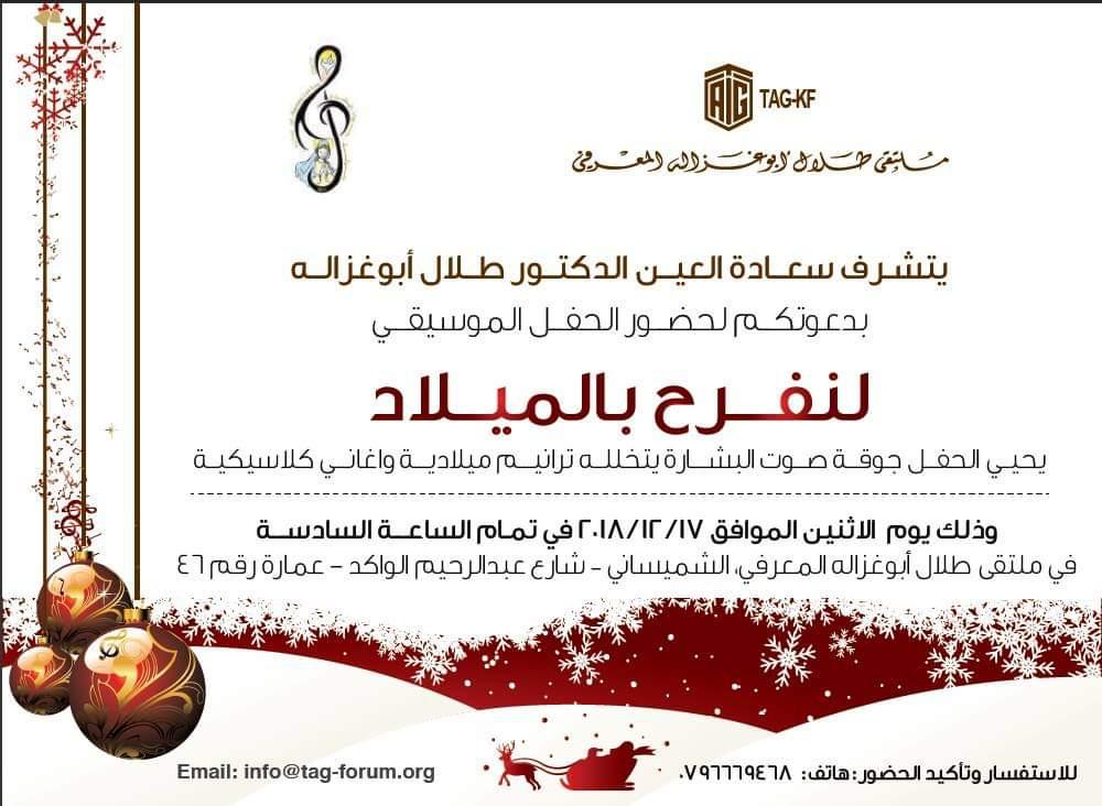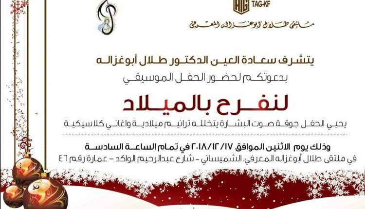 تحت رعاية سعادة العين الدكتور ” طلال أبو غزالة ” ندعوكم لحضور الحفل الموسيقي ” لنفرح بالميلاد “