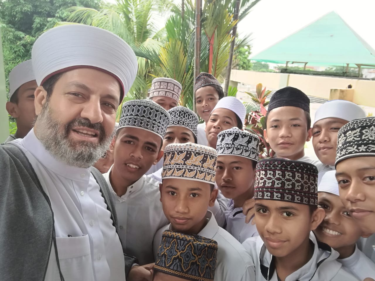 اليوم الثالث من مؤتمر الشهادة في باتام بإندونيسيا لقاء مع الداعية الدكتور الماليزي حسن عبد الله سهل مسؤول المدارس الدينية ولقاء وعظي وانشادي مع طلاب ثلاث مدارس دينية استمر لساعات