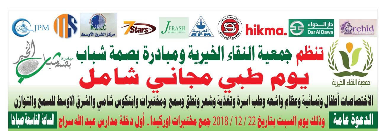 جمعية النقاء الخيرية تقيم يوم طبي مجاني بالتعاون مع مبادرة بصمة شباب On ديسمبر 17, 2018 Share وهج 24 : جمعية النقاء الخيرية تقيم يوم طبي مجاني بالتعاون مع مبادرة بصمة شباب . Share FacebookTwitterGoogle+ReddItWhatsAppPinterestالبريد الإلكتروني