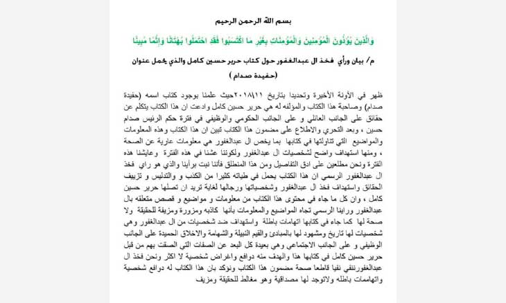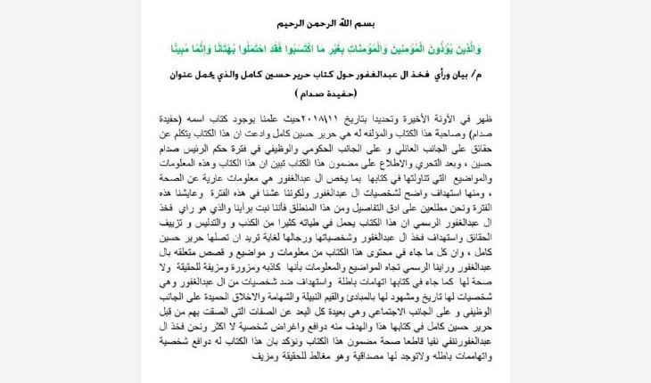 وأصدر وجهاء «فخذ آل عبد الغفور»، وهو الفخذ الذي ينتمي إليه صدام حسين ضمن قبيلة البوناصر، بيانا يهاجم مذكرات حفيدته، ويصفها بـ«الكذب والتدليس وتزييف الحقائق ومهاجمة شخصيات من آل عبد الغفور لغاية تريد حرير حسين كامل أن تصلها»، حسب البيان الذي حصلت «القدس العربي» على نسخة منه بعد نشره على الصفحات الشخصية لبعض أقارب صدام حسين، كما تم توزيعه على عدد من الصحف العراقية والعربية، ويقصـــد البيان هـــنا محاولة تـــبرئة حسين كامل من مسؤولية انشقاقه عن النظام.