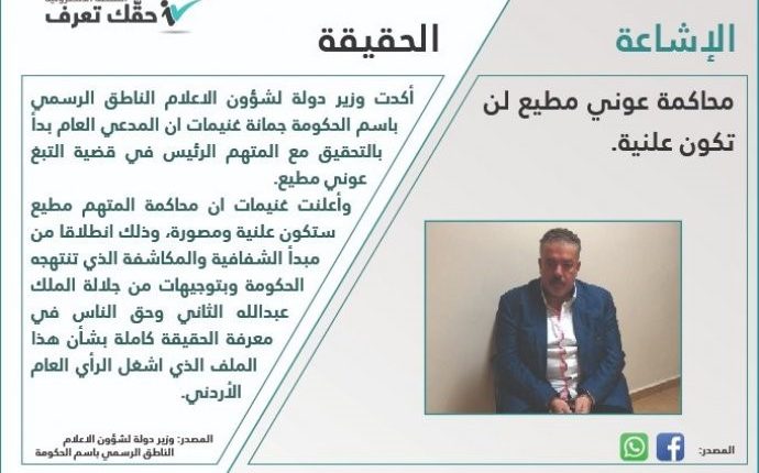 وأعلنت غنيمات أن محاكمة المتهم مطيع ستكون علنية ومصورة، وذلك انطلاقا من مبدأ الشفافية والمكاشفة الذي تنتهجه الحكومة وبتوجيهات من جلالة الملك عبدالله الثاني وحق الناس في معرفة الحقيقة كاملة بشأن هذا الملف الذي أشغل الرأي العام الأردني.