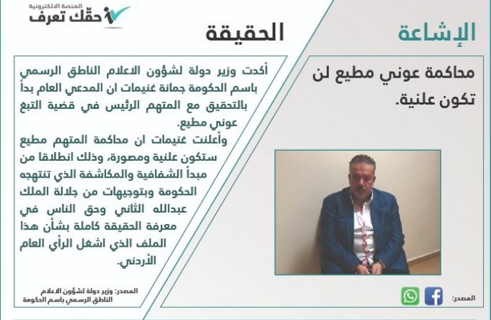 وهج 24 : نفت منصة “حقك تعرف” الحكومية إشاعة مفادها أن جلسات محاكمة المتهم بقضية التبغ عوني مطيع لن تكون علنية.
