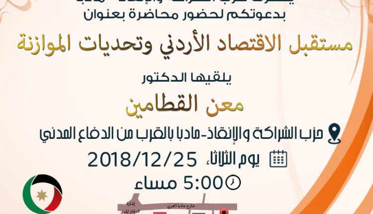 وهج 24 : يتشرف حزب الشراكة والإنقاذ – مادبا بدعوتكم لحضور محاضرة بعنوان ” مستقبل الإقتصاد الأردني وتحديات الموازنة ” يلقيها الدكتور ( معن القطامين ) في مقر حزب الشراكة والإنقاذ في مادبا بالقرب من الدفاع المدني ، وذك يوم الثلاثاء الموافق 25/12/2018 تمام الساعة الخامسة مساءا .