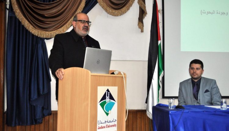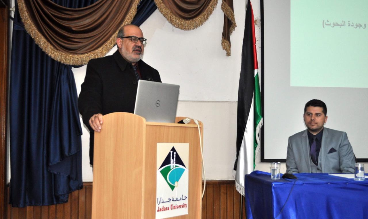 ثم قدم الدكتور علي مطر هذه الورشة حيث تضمنت نظام مكافآت النشر العلمي وشرح مفصل عن هذا النظام الذي أطلق في الجامعة حيث أثنى الدكتور مطر على هذا النظام ودوره في رفع سوية الباحثين وسمعة الجامعة ثم تحدث عن معامل التأثير h-index وقواعد البيانات العالمية المعتمدة لمعاملات التأثير وكيفية حساب هذا المؤشر وما هي المواقع التي تزيد من نسبة هذا المؤشر حيث تم توجيه الباحثين إلى عدة قواعد بيانات عالمية للحصول على المعلومات منها بخصوص الأبحاث والمجلات ليصار إلى النشر فيها حيث تم التركيز على النشر لدى قواعد البيانات ISI و Scopus وخلصت الدورة بمجموعة توصيات للباحثين منها عمل ملف خاص لدى جوجل سكولر وسكوبس وتكريم الباحثين المميزين والاهتمام بمجلة جامعة جدارا والاشتراك بموقع الكشف عن الاقتباس العلمي Turnitin..