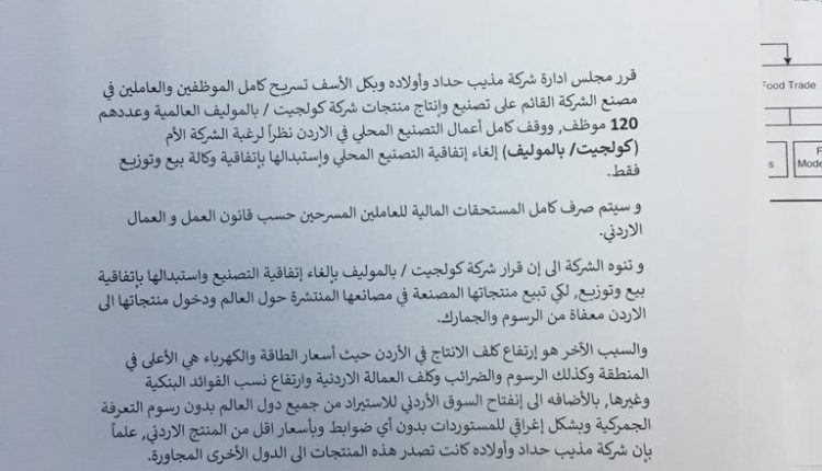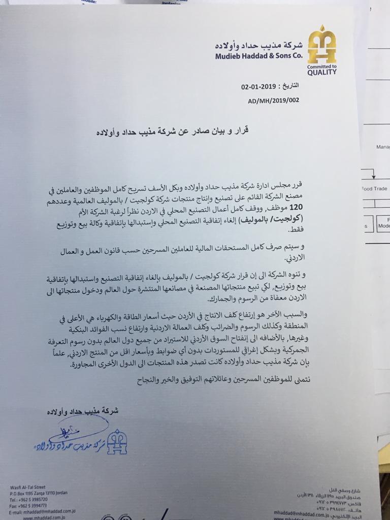 شركة أردنية تعلن وقف الإنتاج وتسريح جميع العاملين / وثيقة