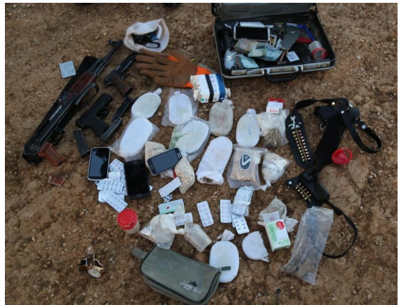 وتابع الناطق الاعلامي انه وبتفتيش الخيمة فقد عثر بداخلها على سلاح ناري اوتوماتيكي ومسدسين وكمية من الذخيرة ، اضافة الى ٩ كفوف من مادة الحشيش المخدر ٣٠٠٠ حبة من حبوب الكبتاغون المخدرة وكمية من حبوب الترامال والزانكس المخدرة و ٥٠ غم من مادة الهيروين المخدرة وبوشرت التحقيقات
