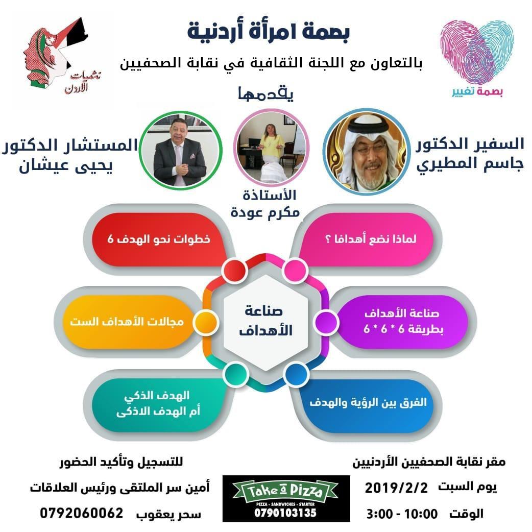 لأول مرة وفي بصمة تغيير فقط *بصمة إمرأة أردنية* بالتعاون مع اللجنة الثقافية في نقابة الصحفيين وبحضور عدد كبير من نشميات الأردن صناعة الأهداف فن الإبداع