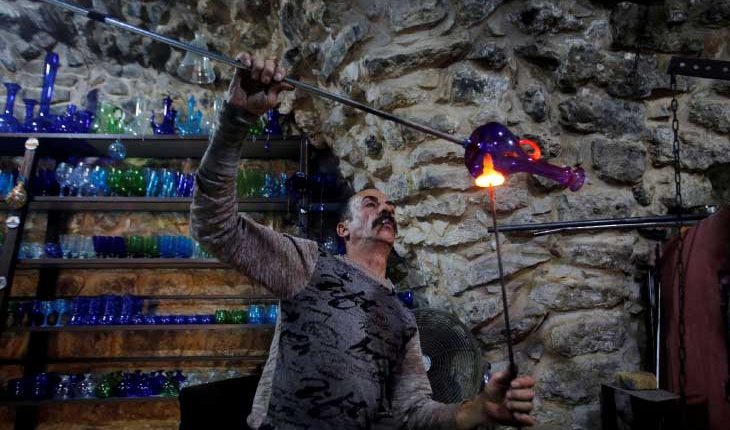 ويستعرض النتشة (57 عاما) مهارته في صنع الزجاج أمام السائحين الذين يتدفقون عل مصنعه الصغير في المدينة حيث ينفخ في الزجاج ويسخنه ويشكله لتماثيل ملونة وكؤوس ومزهريات وغيرها.