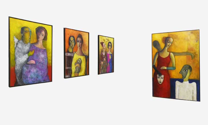 «لكل لوحة فكرة، وهي أشبه بقصص قصيرة رأيتها وعشتها أو عايشتها»، يقول الفنان في لقاء مع «القدس العربي» داخل صالة العرض. ولا تصعب ملاحظة ذلك عند التجوال بين اللوحات التي تبدو وكأنها تدعو المشاهد لرحلة من التأمل والغوص في تفاصيل ملامح وألوان شخصياتها، وهي بشكل أساسي شخصيات أنثوية.