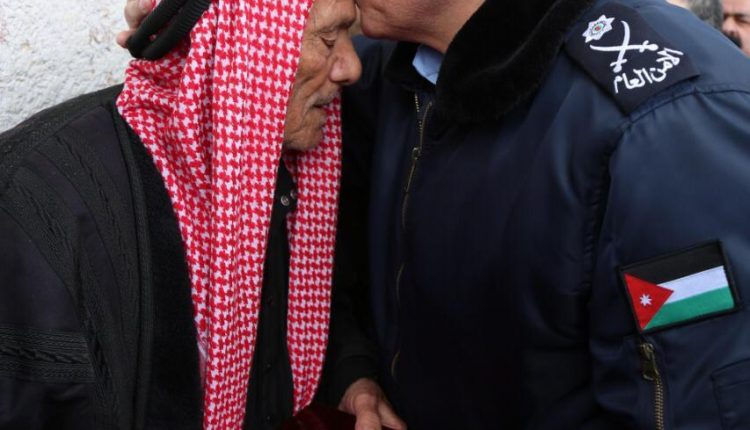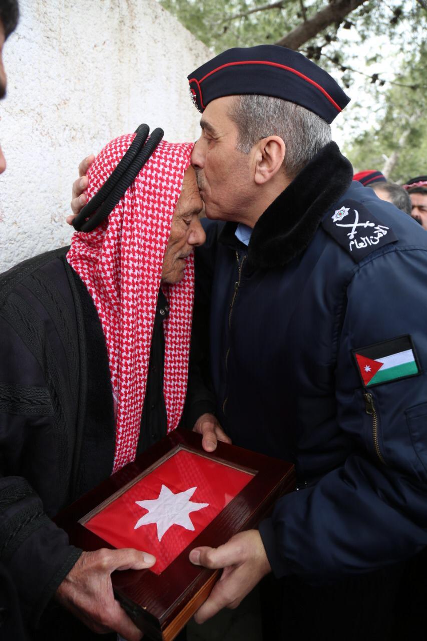 وهج 24 : عهد الأوفياء وقبلة الوفاء على جبين أباء الشهداء .. مشهد يحمل في طياته الكثير الكثير من معاني الوفاء والإنسانية .. مشهد عفوي وتلقائي من عطوفة مدير الأمن العام اللواء فاضل باشا الحمود أثناء تقبيل جبين والد الشهيد الملازم أول احمد محمود فياض الجالودي .. رحم الله شهداء نشامى الأمن العام وكافة شهداء الوطن .