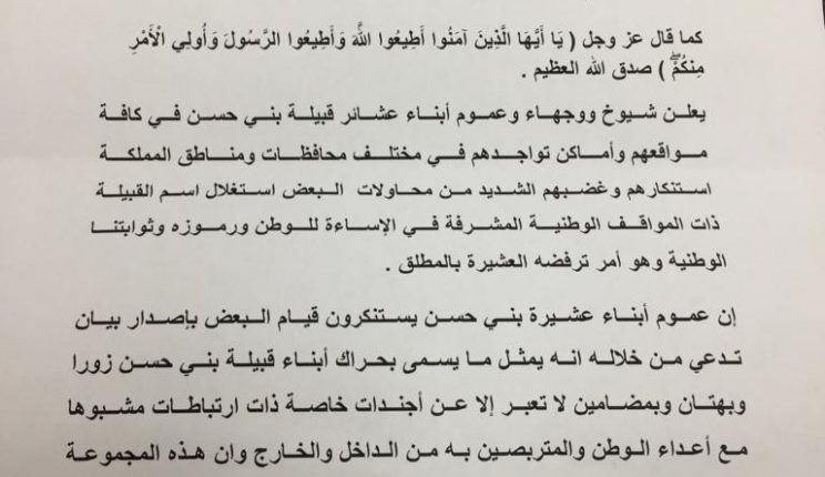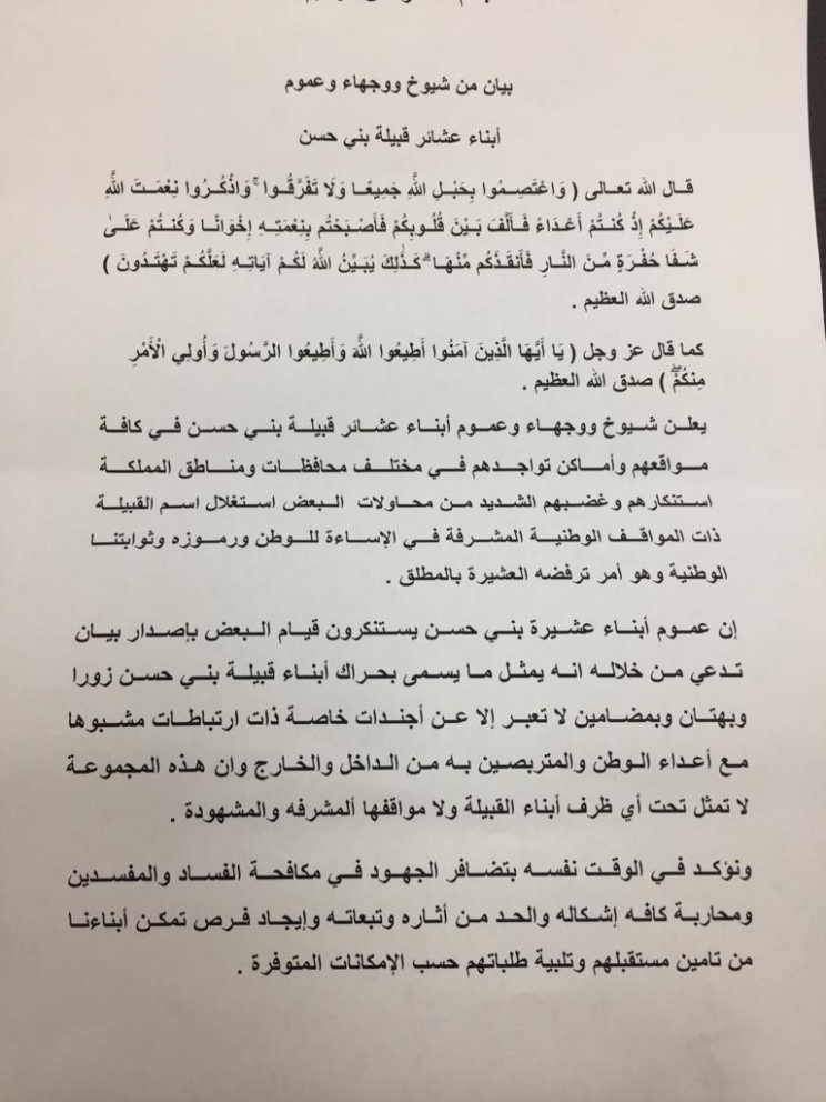 بيان لقبيلة بني حسن : وتؤكد فية انها لن تسمح لاحد بأستغلال أسم العشيرة