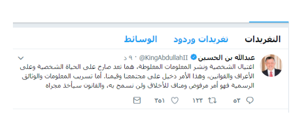 وفيما يلي نص ما كتب جلالته: اغتيال الشخصية ونشر المعلومات المغلوطة، هما تعد صارخ على الحياة الشخصية وعلى الأعراف والقوانين، وهذا الأمر دخيل على مجتمعنا وقيمنا. أما تسريب المعلومات والوثائق الرسمية فهو أمر مرفوض ومناف للأخلاق ولن نسمح به، والقانون سيأخذ مجراه .