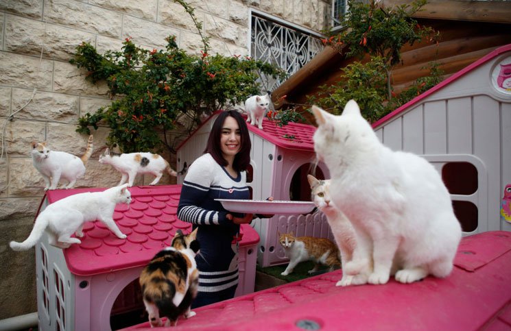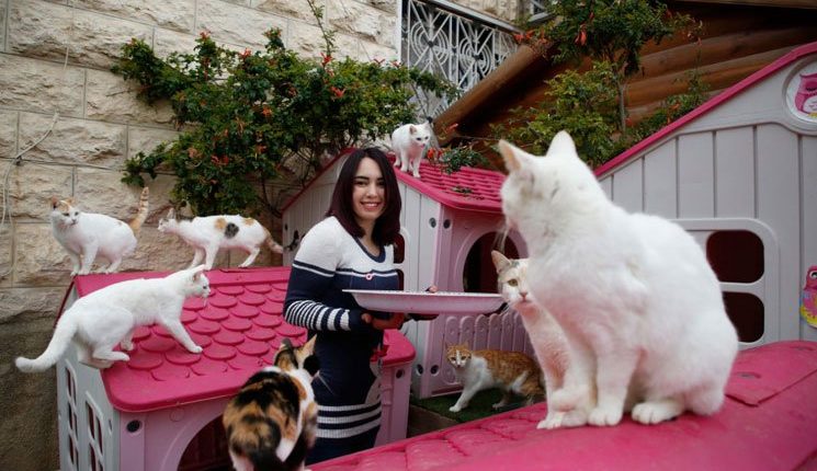 وهج 24 : الفلسطينية هبة الجنيدي (25 عاما) تغذي القطط الضالة في ساحة منزلها بالقرب من مدينة الخليل المقسمة في جنوب الضفة الغربية، وترعى الجنيدي القطط منذ أكثر من 10 سنوات، ولكن منذ عامين حولت حديقتها إلى حوالي 50 قططًا ضالة، وأطعمتها ورعايتها. وركبت سلسلة من “منازل القطط” للحفاظ على الحيوانات في حين أنها تنسق لنقل بعض القطط المريضة لتلقي العلاج