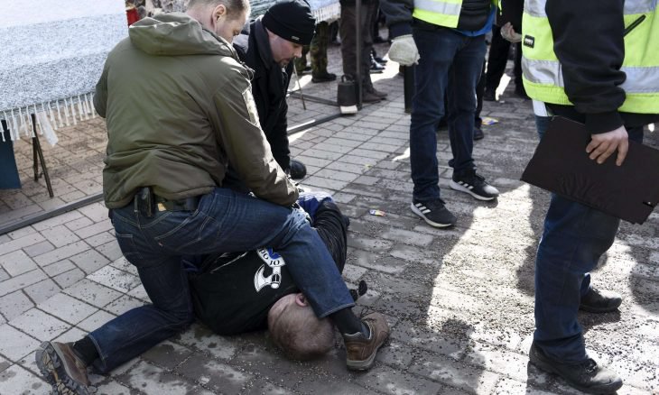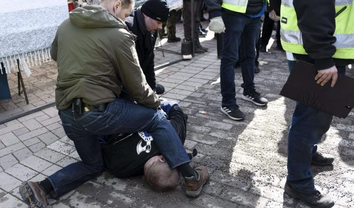 وأظهرت صورة نشرتها الوكالة الفنلندية “ليتيكوفا” تناقلتها وسائل إعلامية محلية رجلا مطروحا أرضا وحارسين يمسكان به ويمنعانه من التحرك.