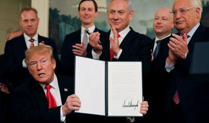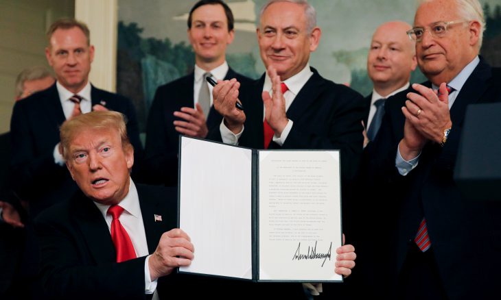 وهج 24 : وقع الرئيس الأمريكي دونالد ترامب، الإثنين، إعلانا يعترف بسيادة إسرائيل على هضبة الجولان السورية التي احتلتها اسرائيل عام 1967 وضمتها في عام 1981.