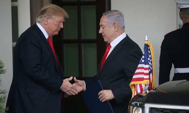 ووقع الرئيس الأمريكي، دونالد ترامب، مرسوما اليوم الاثنين في مستهل اجتماع مع رئيس الوزراء الإسرائيلي بنيامين نتنياهو يعترف فيه بالسيادة الإسرائيلية على الجولان التي احتلتها إسرائيل من سوريا في حرب 1967.