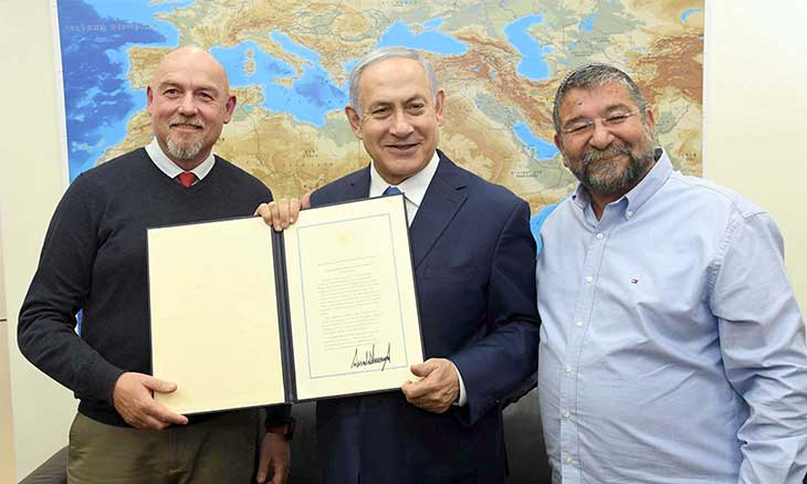 ترامب وقع على الإعلان الرئاسي للاعتراف بالسيادة في يوم الإثنين أثناء زيارة رئيس الحكومة في الولايات المتحدة. في الإعلان كتب أن «دولة إسرائيل سيطرت على هضبة الجولان في 1967 من أجل تعزيز أمنها من التهديدات الخارجية. الآن نشاطات عنيفة من جانب إيران والتنظيمات الإرهابية، منها حزب الله في جنوب سوريا، تواصل تحويل الجولان إلى منطقة محتملة لإطلاق الصواريخ على إسرائيل. أي اتفاق سلام مستقبلي في المنطقة يجب أن يلبي حاجة إسرائيل للدفاع عن نفسها من سوريا وتهديدات إقليمية أخرى. مع أخذ الظروف الخاصة هذه بالحسبان، يجدر الاعتراف بالسيادة الإسرائيلية في هضبة الجولان».