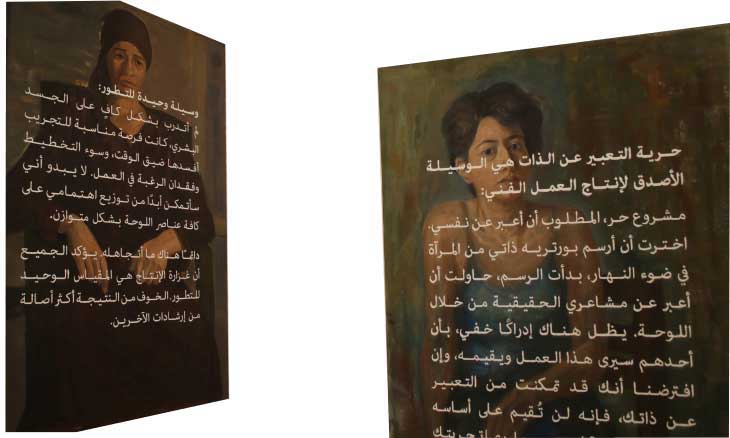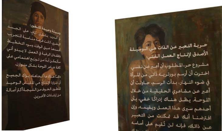 بين الأعمال يقدم عمر عبد الباقي عمله تحت عنوان «ألواح محفوظة» وهو تجهيز مكون من عدد من سجّاد الصلاة، تحمل كل سجادة صور لمنتجات استهلاكية مقرونة بنصوص دينية. النصوص هنا منتزعة من سياقها، كي تحمل معنى مغايراً لما هي عليه. بين الأعمال أيضاً تقدم يمنى السيد تجهيزاً فوتوغرافياً تحت عنوان «زاوية عريضة»، بينما تطالعنا رنا حسين بعمل «أود لو أكون مكتملاً.. الكمال فان». أما نادين علاء فتعرض عملها تحت عنوان «متكرر ومبهم»، بينما تعرض ميار جابر عملها «تخريب متعمد»، وهو عبارة عن نصوص مكتوبة على لوحات زيتية لمشاهد كلاسيكية متقنة. تعيد ميار جابر صوغ تلك الأعمال بالكتابة عليها، كتابات تعبر عن أفكارها ورؤيتها للعمل الفني والممارسة الإبداعية، قد يرى البعض هذه الإضافات تشويهاً للعمل الفني، غير أن فكرة التشويه نفسها مرتبطة بطبيعة الأنماط الجمالية المعتادة والقناعات الشخصية لمفهوم العمل الفني كمحتوى جمالي أو مفاهيمي، أو كونه وسيلة لطرح التساؤلات وإثارة الدهشة.