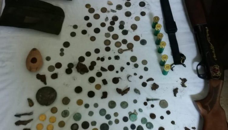 وأضاف الناطق الإعلامي أنه وبمتابعة التحقيق القي القبض على ذلك الشخص وعثر داخل منزله بعد تفتيشه على سلاح ناري وكميات كبيرة من القطع المعدنية والحجرية والتماثيل والمسكوكات الذهبية والبرونزية والتي تبين بعد عرضها على خبراء الآثار أن١٧٠ قطعة منها ذات قيمة تاريخية تعود للعصور الرومانية والبيزنطية القديمة ، والتحقيقات مستمرة .