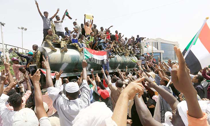 شبكة المصالح الدولية هذه تمر الآن بهزة قوية في أعقاب عدم اليقين حول مستقبل القيادة العسكرية والسياسية في السودان. يتبين، قريباً، أن الضباط الذين عزلوا البشير لا يوجد بينهم تناغم. بداية عين وزير الدفاع عوف نفسه رئيساً للمجلس العسكري الذي يمكنه إدارة شؤون الدولة مدة سنتين، وكان يجب أن يكون إلى جانبه الجنرال كوش، وقائد شرطة السودان وقائد قوات التدخل السريع الجنرال محمد حمدان، ولكن حركات الاحتجاج استأنفت المظاهرات التي شارك فيها الملايين في أرجاء الدولة، وطلبوا نقل شؤون الدولة على الفور إلى حكومة مدنية مؤقتة تقوم بصياغة دستور جديد وإجراء انتخابات ديمقراطية.