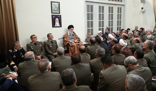 وخلال استقباله قادة الجيش والقوة البرية بمناسبة اليوم الوطني للجيش الايراني، وصف آية الله السيد علي الخامنئي الجيش اليوم بأنه اكثر تدينا واكثر فاعلية، معربا عن تقديره وتثمينه لحضور الجيش والقوات المسلحة في إغاثة المنكوبين بالسيول، ومؤكدا ضرورة مزيد من الوحدة بين القوات المسلحة، ومشيدا بالاخوة بين الجيش والحرس بعد الاجراء الاميركي القبيح ضد الحرس الثوري، وقال: ان اي عمل يثير غضب العدو واستياءه، فهو جيد وصحيح، وفي المقابل على الجميع ان يتجنبوا اي فعل يزيد من جرأة العدو ويعزز معنوياته.
